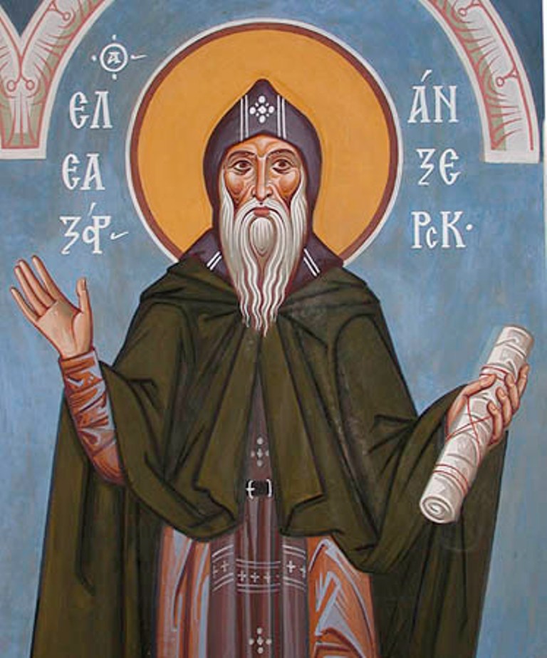 Преподобный Елеазар Анзерский (1656). В 1612 году, по благословению игумена, он удалился на Анзерский остров, где стал отшельником и постоянно пребывал в молитве и Богомыслии. Преподобный Елеазар занимался книгописанием. Он составил и переписал три книги "Цветника", в которые вошли старинные повести. Ему принадлежит также толкование на чин келейного монашеского правила. Скончался преподобный Елеазар в глубокой старости.и. https://days.pravoslavie.ru/Life/life211.htm